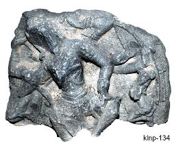 | Description / विवरण | Mahishasuramardini standing in dwibhanga posture not clear . The lower portion, right side hands and left top portion, and upper second right hand are broken and missing. She is represented with eight hands. The weapons seen in her left hands from top to bottom are shield faintly seen , bana bow , she holds the head of buffalo Mahisa with her left third hand and tail of the animal with her lower fore hand, she holds a small sword with her upper hand, which is seen clearly. She wears karandamakuta, keyuras, wristlets, kanthaharas and necklaces, katisutra andornamental waist-band. Facial features mutilated. |