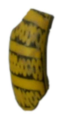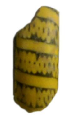 | Description / विवरण | Fragment of black colour glass bangle decorated with yellow colour pigment. Broad lines are drawn horizontally on the upper face and the space in between is filled with interlinked circles horizontally. |