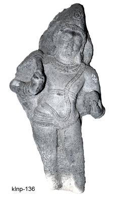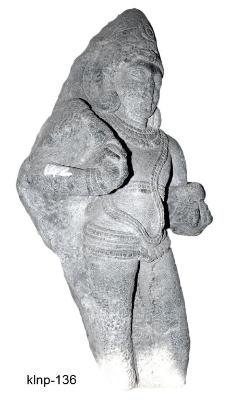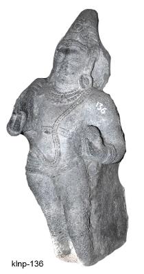 | Description / विवरण | Dwarapala standing in dwibhanga posture. He is represented with two hands. He holds a ball like object in his left raised hand and chamara in his raised right hand. He wears a series of kanthaharas, triple stranded yajnopavita, chest-band, katibandha, waist-band having a beaded chain in between two thick bands, beaded wristlets, kundalas and dhammilla type of head gear tied with jewelled band on the forehead. He has round face, folded chin, long snubbed nose, thick lips, lenticular eyes and thick eye brows. A halo is seen behind the head. The lower portion below the knees broken. |