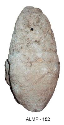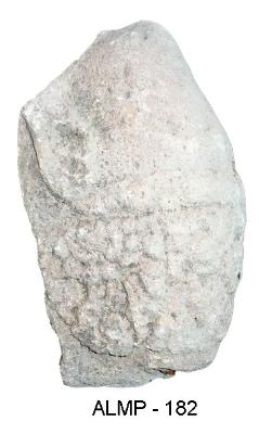 Head of an idol. It has conical ornamental headgear and oval face. Iconographical features abraded.