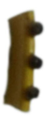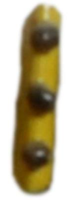 | Description / विवरण | Fragment of yellow colour bangle, decorated with black colour button shaped projected bodies in a row on the upper surface. A pair of grooves on the later sides. |