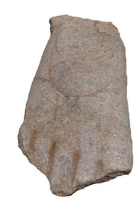 | Description / विवरण | A broken foot carved on white granite stone. The toes and ankle portions are broken and missing. There is a semicircular raised part or broad patta on the dorsal face of the foot extended upto ankle. |