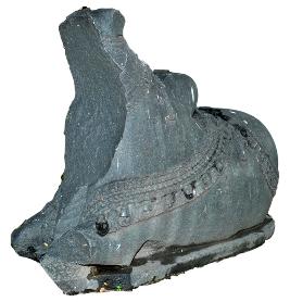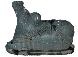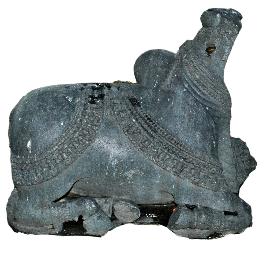 | Description / विवरण | Nandi squating with the hind legs bent inwards to the left. It is adorned with thick broad belt on the back. The one on the front side shows huge size of bells while the one on the hind side has foliage patterns. Hump is prominent. |