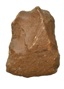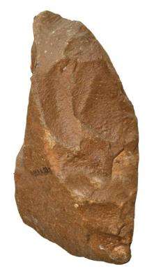 | Description / विवरण | A cleaver cum axe made on rectangular thick flake. It has neatly flaked flat functional edge on one side and thick irregularly flaked buttend. Broad flake scars are seen from both the faces. It shows the application of block on block technique for preparing the tool. |