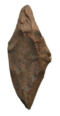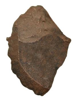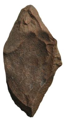 | Description / विवरण | A small cleaver cum borer made on medium size flake. It has thick back edge on one side and flaked broad arch like functional thin edge on the other side. It shows bulb of percussion on the ventral side. |