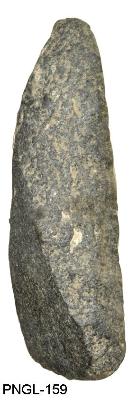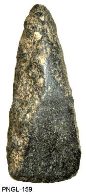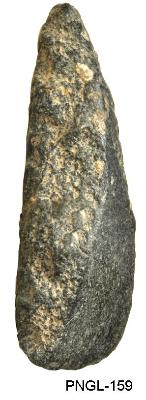 | Description / विवरण | Triangular shape polished stone axe having flat cutting functional edge and pointed but tend. Plano-convex in its cross section. It shows pecked body surface on both the sides. Grinding and polishing dorsal surface is extended from the cutting edge to the buttend. |