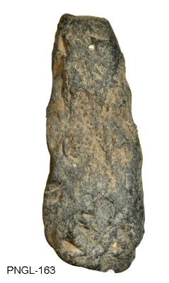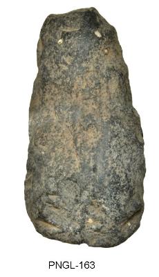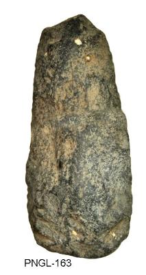 | Description / विवरण | Triangular shape stone axe having straight functional edge and broken blunt buttend. It has flaked and pecked body surface. The implement is under preparative stage. Ovoid in its cross section. |