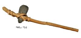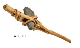 | Description / विवरण | A well finished triangular shape stone axe having sharp, straight functional edge and pointed blunt buttend. It has well pecked and polished body. It is lenticular in its cross section. It is tied to a wooden handle to demonstrate the functional aspect. |