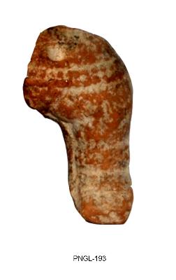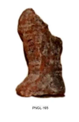 | Description / विवरण | Lower portion of human figurine. It shows double stranded beaded mekhala and beaded anklets. The figure is made of double mould. Broken at middle of the waist and mended neatly. |