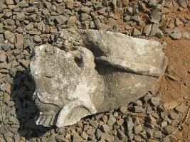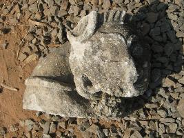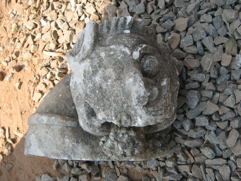 The bust of lion is Carved out on a stone block. Head band is present. A band on neck is also visible. One ear is visible. It has buging eyes and a prominent moustach.