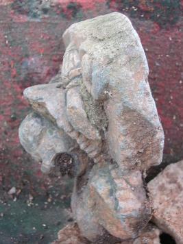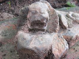 | Description / विवरण | Bust of Narasimha, found usually as parsvadevata in northern niche of a Vaishnavite shrine Bulging eyes and gaping mouth with projected teeth, nose is flaring resembling a lion face. Sacred thread, a beaded necklace and portion of vanamala are noticed on left shoulder. |