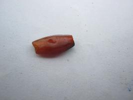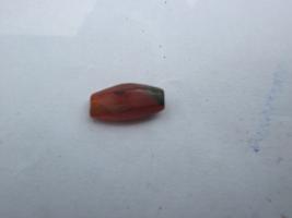 | Description / विवरण | A pentagonal long shaped bead in deep orange colour having a perforation in exact middle. The cutting line is not perfect. One side of the hole face is slightly broken. Other side of the face has a black colour mark. |