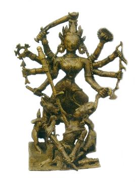 | Description / विवरण | The octo-alloy sculpture of Mahisa-marddini has been unearthed in 18th century A.D. comprises devi holding weapons of mass destruction in her ten hands.She has lots of jewellery like round earings, armlets and crown in her head . The spear peirced through the chest of the demon killing him and the lion being the medium accompanying Devi s quest of restoring balance in the universe. |
