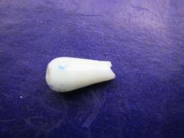 | Description / विवरण | A long bead made from white coral having hole in centre. It is tapparing from one end to other end. Face of the hole in pointed side is broken. Erosion mark on hole face of brad end proves it entier use. |