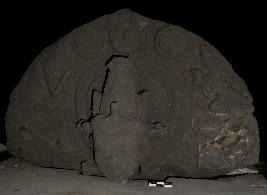 | Description / विवरण | Fragment of a sculpture depicts only the facial portion of Lord Vishnu . He is wearing Kirita Mukuta, circular ear ring with down ward facial expression. A hallow is placed over his head. A bejeweled Gandharba couple is visible on the stella. |