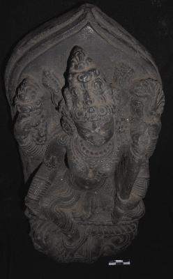 | Description / विवरण | The sculpture depicts four armed seated image of Devi Maheswar i in Lalitasana on a full bloomed lotus. The deity is having three eyes, smiling face, sharp nose and prominent eyebrows. She wears Jata Mukuta, circular ear rings, necklace, ornamented waist band, bangles, armlet and anklets. An ornamented stella is placed behind her head. Her vehicle bull is visible below her right leg. |