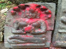 | Description / विवरण | It is a fine image of Manasa devi covered by a sever hooded snake above her head and is seated on a dhyana mudra. It holds a pot in her both hands and has ornaments. The slab is broken in two parts at the middle portion. |