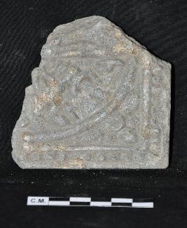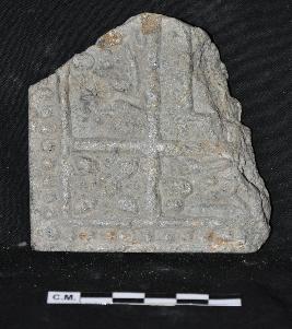 | Description / विवरण | A broken miniature slab depicts decorated floral design with beaded border on both sides. |