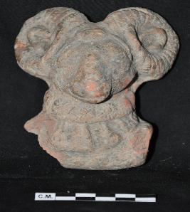 | Description / विवरण | The terracotta head of ram having jewelled band with floral medallion on forehead and decorated neck band. Its horns are rendered by incision. |