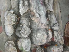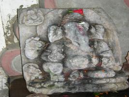 | Description / विवरण | It is a sitting Ganesha image on a seated lotus pedestal. His right upper and lower hands hold a mala and shown in varada mudra respectively. Its othrer two hands are broken. Part of trunk is also broken. One flying vidyadharas is noticed on the top right conner. The top left corner is broken. |