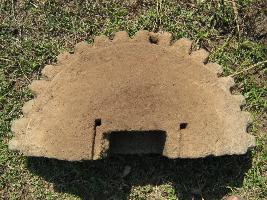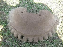 | Description / विवरण | This stone block is carved in circular fashion. Only half of the stone is available. On the top a deep rectangular groove is visible. On its two sides two small groove marks are visible. |