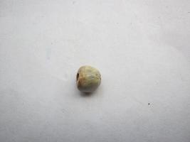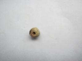 | Description / विवरण | Roughly circular white colour agate bead, with hole not exact center. One side has a conical projection. Grey and ashy colour patches are noticed. |