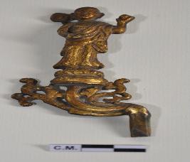 | Description / विवरण | Part of a Sculpture envisaging miniature image of Buddha with a bowl in his upraised left hand while the right hand probably in offers tone.He is ornamented with the depiction of a lotus on his right shoulder.He is standing on a lotus pedestal. |