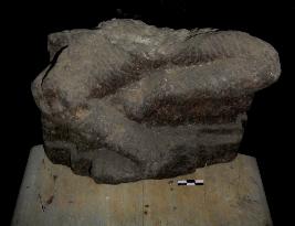 | Description / विवरण | The fragment of a sculpture depicts only leg portion of a male deity is seated on a pedestal. His lower garments come up to knee. |
