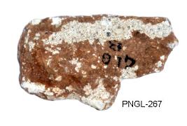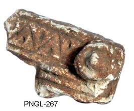 | Description / विवरण | Fragment of stucco work depicted with a design of lotus medallions broken connected by a triangular design in between two thick bands. |