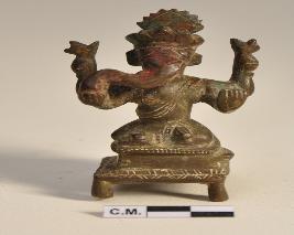 | Description / विवरण | Four armed miniature Ganapati in seated posture.The image rests on small fourlegged rectangular pedestal accompanied by his attendant rat. |