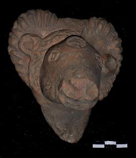 | Description / विवरण | A head of a ram with appliqu round eyes and horns. The figure wears decorated head band and round stamped decoration adorned its fore head. |