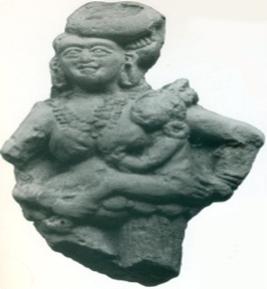 | Description / विवरण | This is a fragment of a plaque in high relief representing a heavily bejewelled figure holding a child in her arms. The lady wears an elaborate turban placed on one side of her head and wearing a doouble stringed necklace, bangles and large circular ear ornaments and two pronged headgear and bangles. |