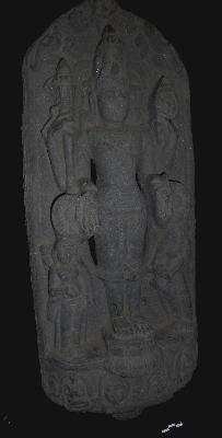 | Description / विवरण | The fragment of a stone sculpture depicts Lord Vishnu standing on a full bloomed lotus. He is wearing decorated waist band, Vanamala up to knee and anklet. Lakshmi and Saraswati are standing on both sides. Both of them are highly ornamented. Lakshmi is holding fly whisk and Saraswati is holding Vina. A small image of Garuda in Anjali mudra is visible left side of the Stella. Fold of his dress is very clear and come up to knee. |