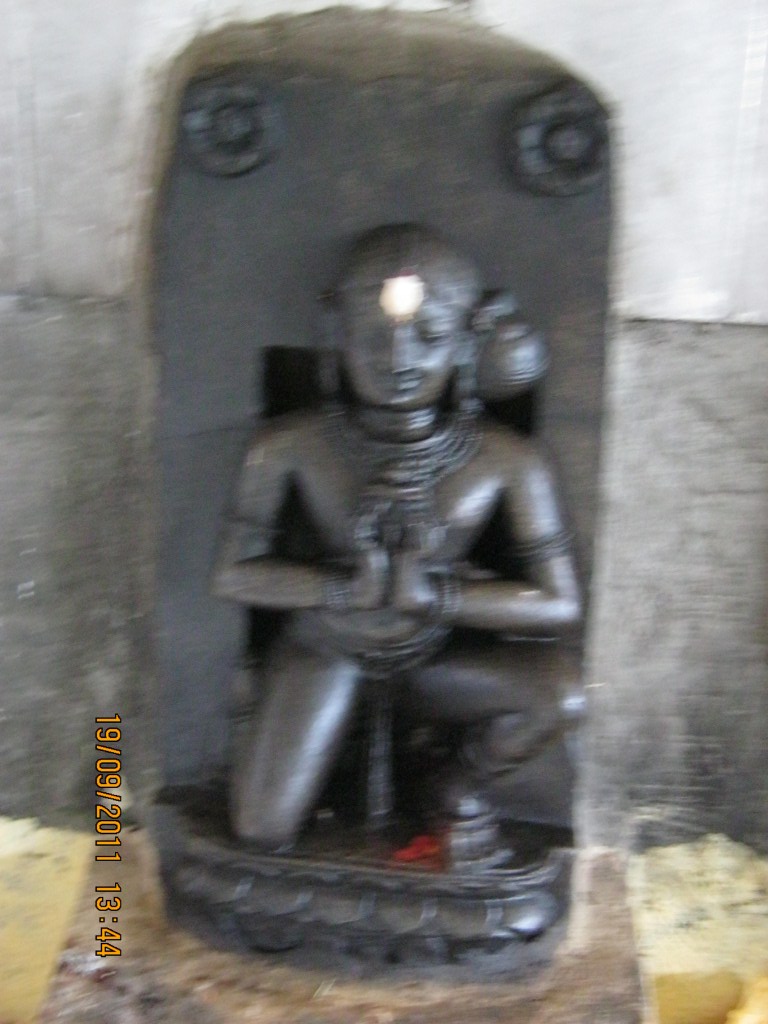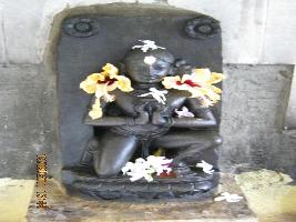 A kneeling devote sitting on a double petalled lotus, his left knee is raised. Right leg is bent from the knee. Holding a lotus in both hands in front. Hair is parted in middle. Hair is styled as a bun on left side. Ornaments are ear stud, necklace, armlet, bracelet, griddle and drapery is hanging between two thaighs. Both upper corners of the back slab has two flower motis.