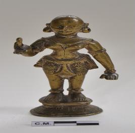 | Description / विवरण | Miniature standing image of Radha on a circular lotus pedestal offering Vitarka mudra by her right hand while left hand hanging loosely. |