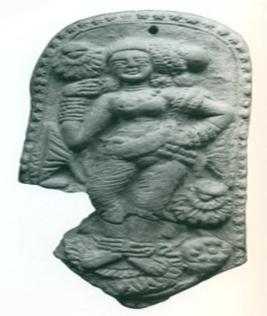 | Description / विवरण | The plaque portrays a lady adorned with an elaborate headgear and standing on a lotus. The figure is holding a stalk of a lotus in her right hand. While the left hand rests on her hips. She wear diaphanous clothes. The apparent nudity of the figure, the association with the lotus and the hieratic frontal posture reiterate her divine status. She may be identified with Sri, the goddess of abundance and prosperity. |