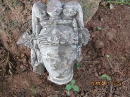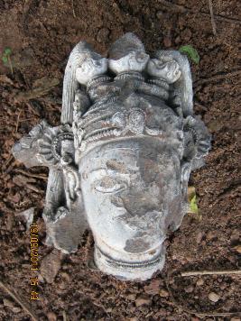 | Description / विवरण | A defaced head of Kartikeya, identified from his popular style trikhandaka ornate tiara. Necklace is depicted. |
