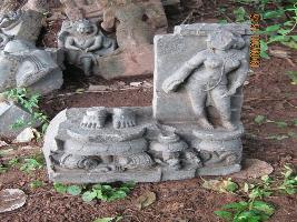 | Description / विवरण | A part of a sculpture having a female attendant standing on left side which defaced as left hands rest on thaigh. Necklace, sacred thread, arm and bracelet, bangle with hair styled as bun on left side are found as decoration. Only two feet of main deity having anklets and standing on a double petalled lotus in left. Below lotus on left two kneeling devotees, one male and one female are depicted. |