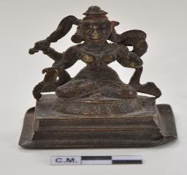 | Description / विवरण | Miniature seated four armed Devi image wearing usual ornaments and crown.She is seated in Padmasana on a lotus pedestal offering abhaya and varada Mudra by her real arms while the upper arms are holding a shield and Khadga .The image may be identified as parvati . |