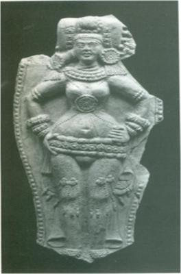 | Description / विवरण | The lady with ten auspicious hairpinsdecorating her bicornate headgear. She is ornamented with a triple stringed girdle, channavira on her torso, earrings with beads of pearls attached to it and a heavy neckband. The plaque in high relief delineates her anatomy and jewellery. |