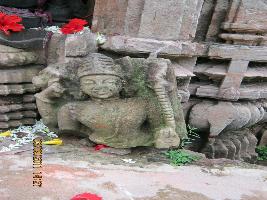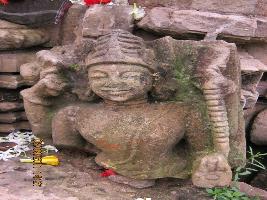 | Description / विवरण | Bust of Siva having a third eye is lying near temple. It holds a Dambaruk in his raised hand. Principal right hand is broken. Principal left hand, displays abhaya mudra and other left hand holding trident is broken . Jata mukuta with tiara, thick earings, bracelets and sacred thread are found as ornaments. |