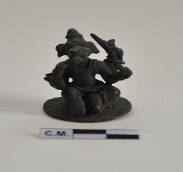 | Description / विवरण | Miniature four armed setaed image of ganesa .The extant portion visualising Ganesa seated on lalitasana with his usual attributes.The upper right arm is broken. |