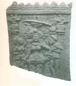 | Description / विवरण | The enshrined deity with ten auspicious hairpins attached to her headgear. The goddess is standing on a higher platform who is waiting with a tray or bowl. She wears thick necklace, bangles, a triple stringed girdle and armlets. Her bicornate headgear with the central floral rosette is decorated with five hairpins styled as weapons of war. From these emblematic hairpins hang strings of pearls. She accompanied by two attendants with fans on either side and a young woman holding a parasol over her head. A small winged male figure with the lower body of a bird appears to scatter flowers on the goddess. She standing in a pillared hall with turreted roof. |