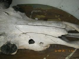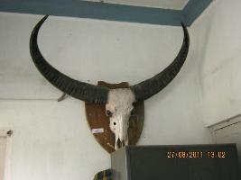 | Description / विवरण | A head of Bison without skin is fixed on a wooden plate. Some hard materials are inserted in both the eye holes. Only upper jaw is available. Lower jaw is missing. Some small porosisy is visible on its body due the decay of the material by weathering. |