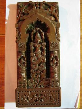 | Description / विवरण | The sepent deity is the central figure placed in a cusped arched gate design. The lower part of boby is serpent and from waist onwards it is human having a 7 hooded surpent design above the head. Back side of the image is perforated. The pedestal is decorated with floral motif. |