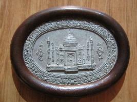 | Description / विवरण | The plaque made up alluminium is containing the image of Tajmahal fixed in a wooden frame. Beaded design and two floral mottfs are flanking the Tajmahal. Underneath the Tajmahal replica there is depiction of the name Tajmahal in English. |