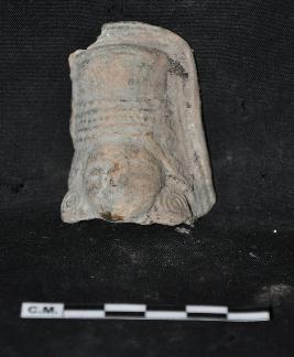 | Description / विवरण | A broken terracotta plaque depicts a male figure with round eyes ,blunt nose and curved lip. The figure adorned with elongated crown and circular earrings. |