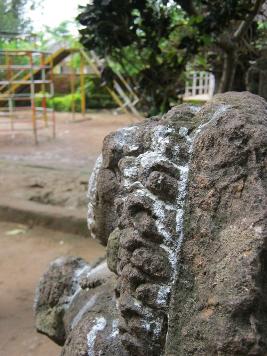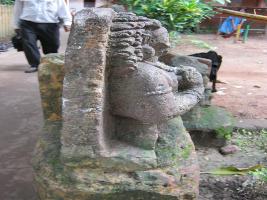 | Description / विवरण | Carved in alto relive with bulging eyes, projected nose, heavy ear rings and flaring curly hairs. |