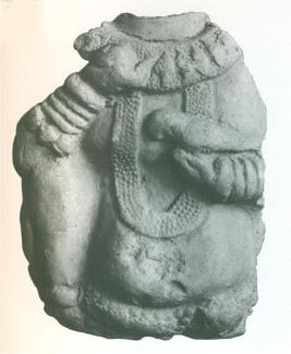 | Description / विवरण | This is the front portion of a pot-bellied man holding a bird in his left hand and probably feeding it with his right hand. The figure is adorned with long necklaces, heavy bangles and anklets. A more elaborate plaque depicting a man feeding bird is known from the site S. K. Mukherjee, 1991a . |