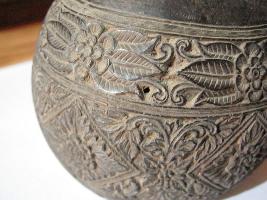 | Description / विवरण | This is a pot made from coconut shell. It is having a good pohish. Carving is done on it with gematrical and floral motifs. Three bands divide the carvings. |
